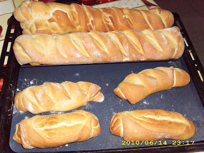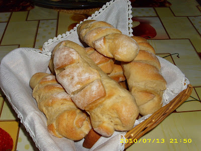 Colocar pela ordem acima referida na cuba da máquina, e selecionar o programa 6, depois de terminado o programa, colocar a massa sobre uma mesa previamente enfarinhada. Depois retirar pedaços de massa de +- 40 grs e espalmar com um rolo da massa, sobrepor os dois e enrolar. Depois fazer um golpe na transversal e deixar tapados a repousar até atingirem o dobro +- 15 a 20 minutos.