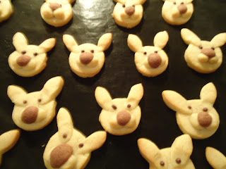 Numa tigela trabalhe suavemente a vaqueiro, o açúcar e o sal. Junte a farinha e amasse rápidamente até obter uma massa maleável. Divida a massa conforme as cores que quer fazer (eu não quis colocar corantes).Vai ao frigorifico durante 1 hora.Cortam-se as bolachas com um cortante redondo, com uma tampa das garrafas de água, prensa-se no meio da bolacha e por fim, com um um bico de pasteleiro redondo pequeno, fazem-se os buracos nos botões.Vão ao forno 10 minutos, pré-aquecido a 180º C.